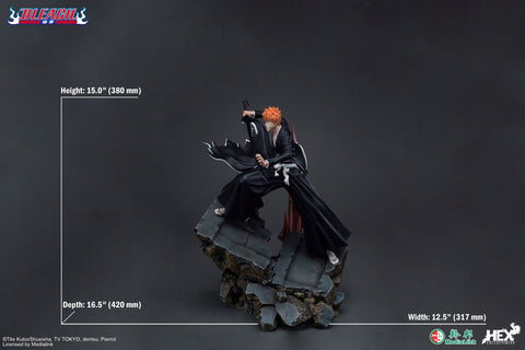 In this stunning Bleach collectible, Ichigo wears his iconic Shinigami attire in Bankai form fully sculpted with realistic and natural pleats. He steps on the rubble and debris of destroyed buildings in his inner world and struggles to resist the powerful attack from Hollow Ichigo.