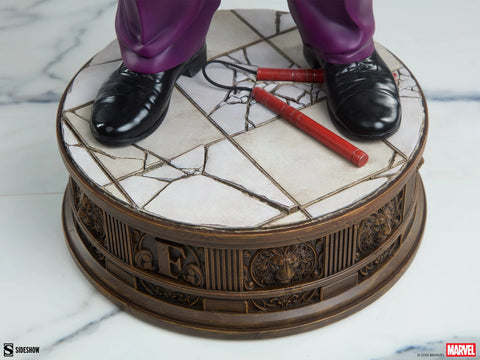 Rendered for the first time ever by Sideshow's artists, the quarter-scale Kingpin Premium Format™ Figure captures his comic book appearance in a fully sculpted polystone display. His costume features classic coloring, with a white suit jacket, yellow vest, purple dress shirt, and purple pants. Fisk's massive knuckles are accented with jeweled rings and a gold wristwatch to complete his businessman's attire.