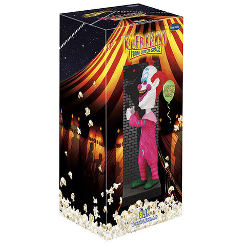 Straight out of the cult-classic Killer Klowns from Outer Space, this Slim Shadow Puppets Bobblehead captures the eerie charm of Slim in a one-of-a-kind pose. Complete with outstretched fingers creating a shadow puppet on the backdrop behind him, Slim stands approximately 8" tall bringing the movie's unforgettable style to life. Created with fans in mind, this hand-crafted polyresin bobblehead is ideal for lovers of 80s horror and campy sci-fi, transforming any shelf into a nod to this beloved classic. Whether a personal collectible or gift for a fan, it's an iconic piece that brings chills and chuckles.