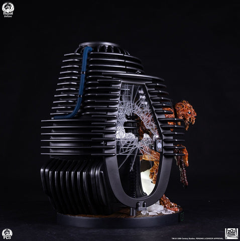 The Deluxe Edition includes the pod itself, complete with light up smoke pouring forth from the chamber, broken glass and the remains of Seth Brundle's lower jaw littering the floor around his foot. This Deluxe base also includes a removable "THE FLY" logo for additional display options.