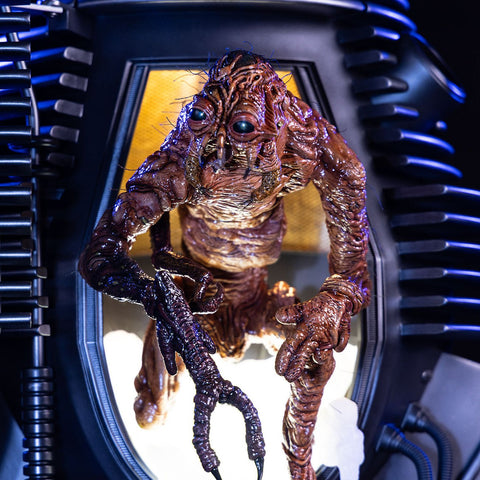 Standing nearly 24" tall, this highly detailed collectible depicts the hideously transformed human/fly hybrid stepping out from the teleportation chamber that acted as the catalyst for this macabre metamorphosis. The Fly is presented here as a fully sculpted, hand painted statue featuring an incredibly detailed sculpt of the misshapen organic forms that make up the creature.